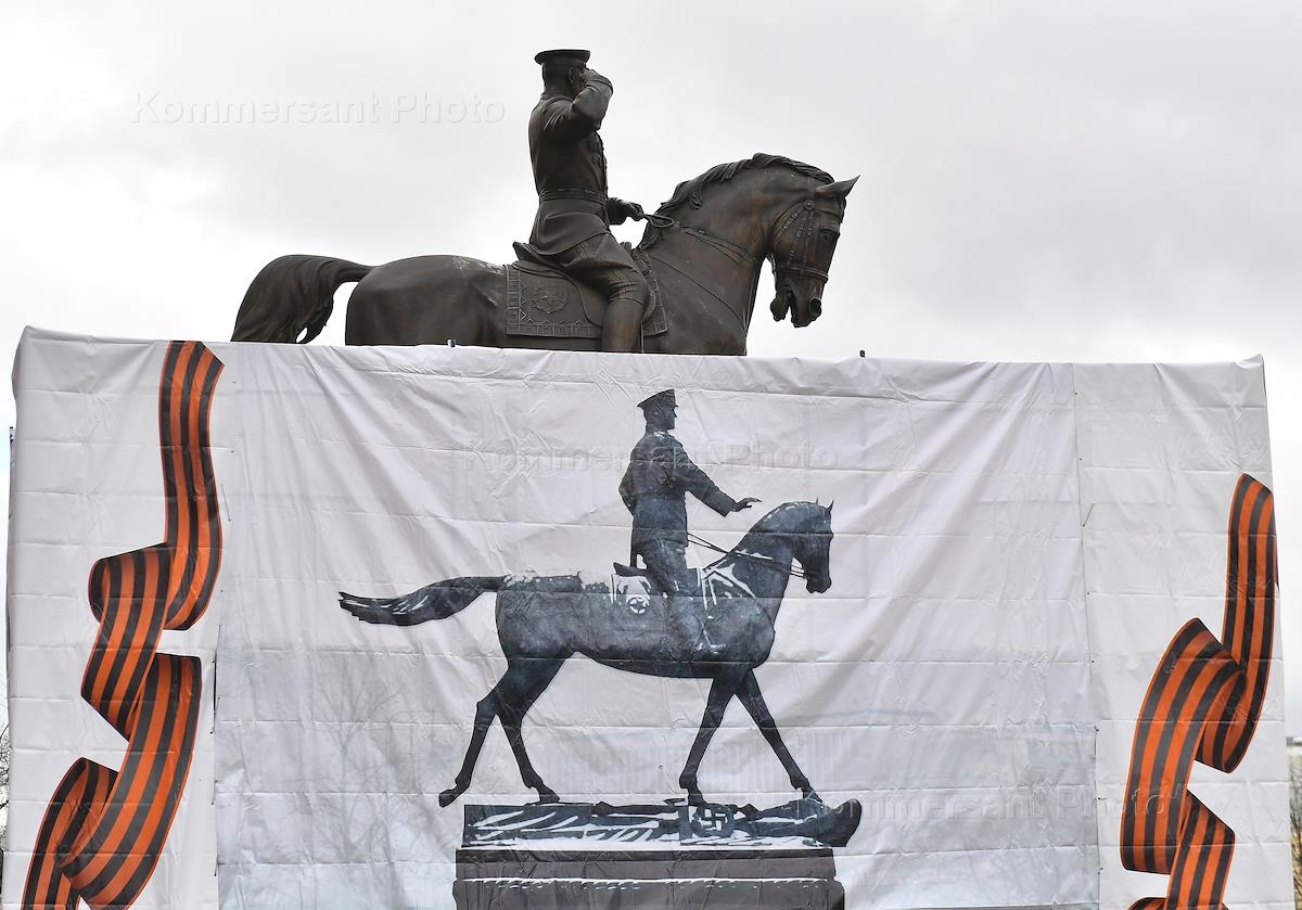 Процедура замены старого памятника маршалу Георгию Жукову на новый на площади перед зданием Исторического музея.