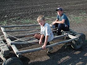Жанровая фотография. Базарно-Карабулакский район. Молодой человек и мальчик едут по проселочной дороге на телеге.