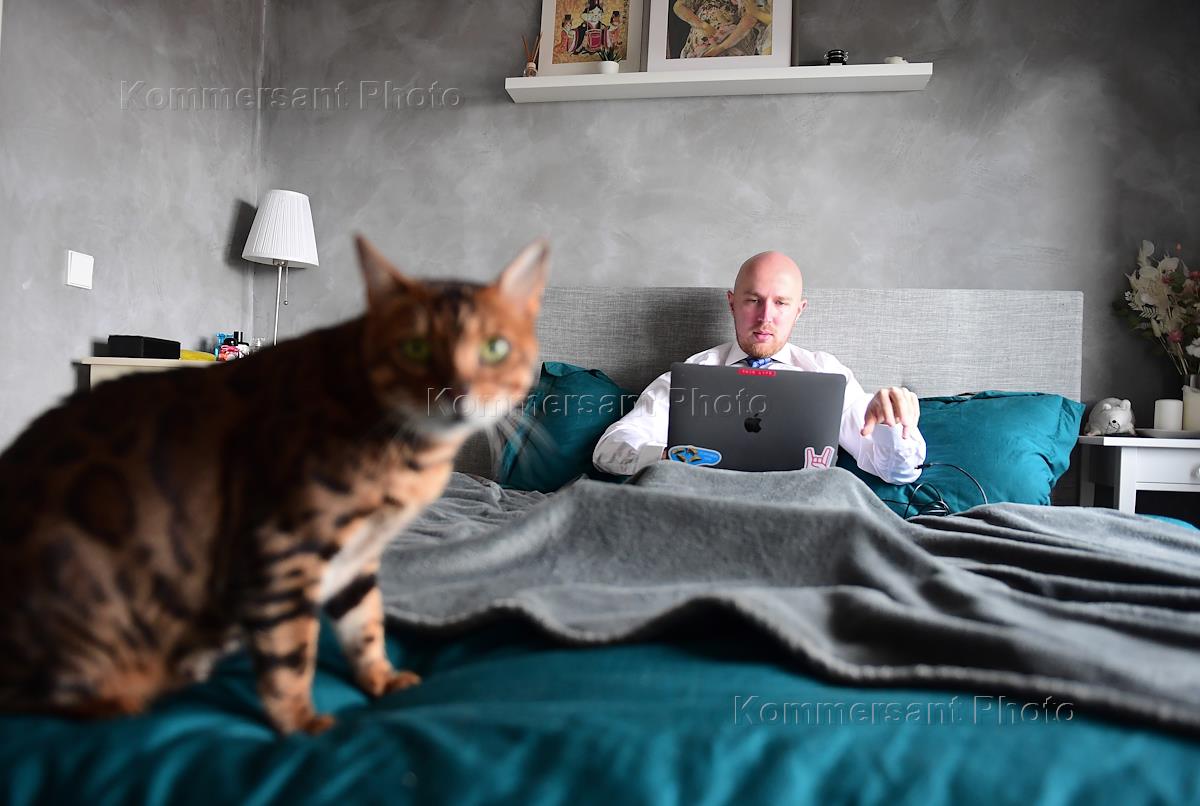 Москва во время режима самоизоляции из-за угрозы распространения коронавирусной инфекции COVID-19. Жанровая фотография. Мужчина в рубашке и галстуке на кровати с ноутбуком и смарфоном .