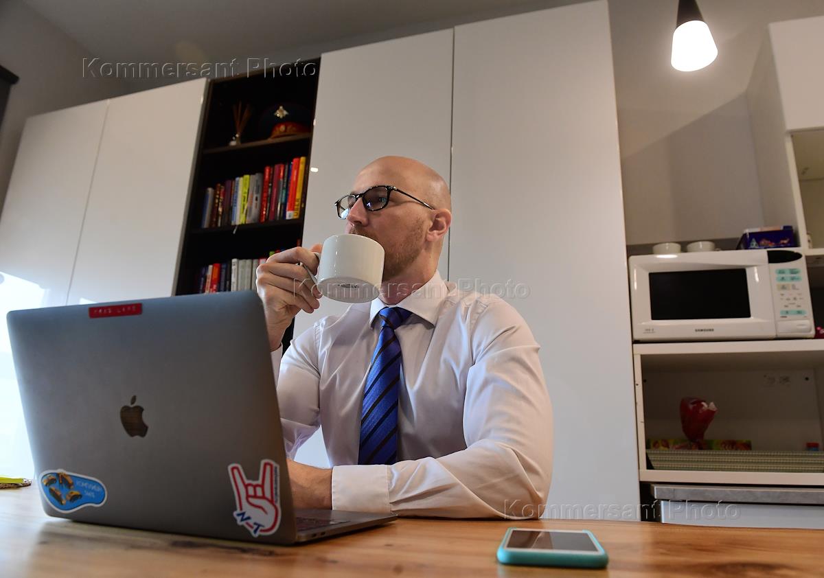 Москва во время режима самоизоляции из-за угрозы распространения коронавирусной инфекции COVID-19. Жанровая фотография. Мужчина в рубашке и галстуке на кровати с ноутбуком и смарфоном .