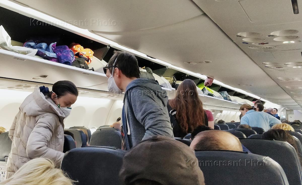 Vnukovo Andrei Tupolev International Airport during quarantine caused by the danger of the coronavirus COVID-19 spread. Genre photo. Passengers wearing face masks are seen in the cabin.