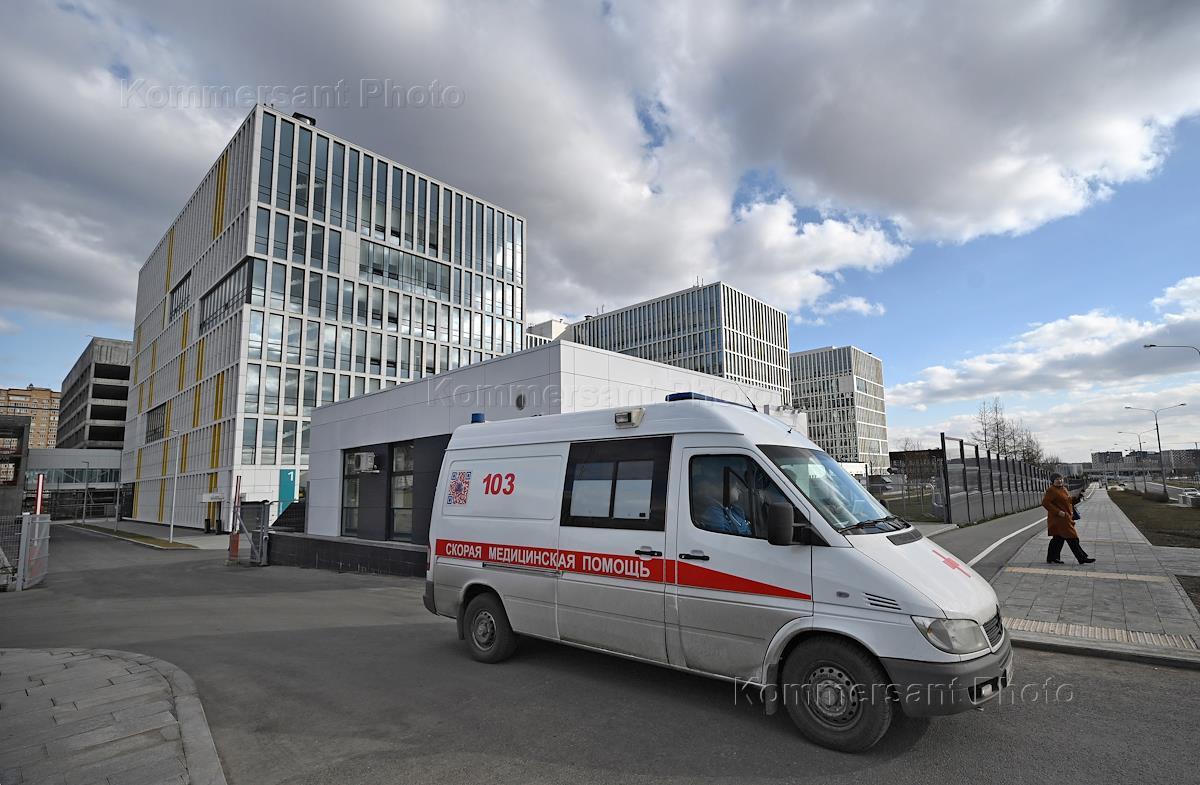 Медицинский центр "Новомосковский" в поселке Коммунарка Новой Москвы. Сотрудник медицинской службы в специальной одежде у машины скорой помощи.