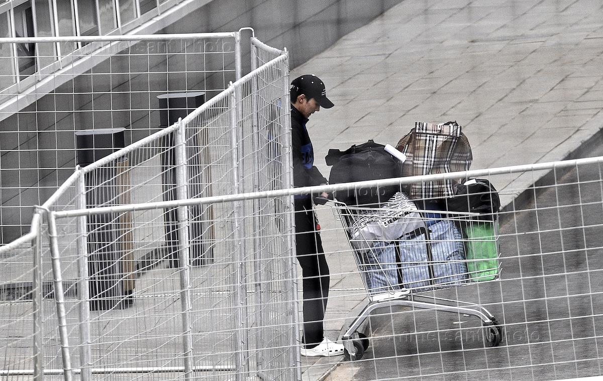 Медицинский центр "Новомосковский" в поселке Коммунарка Новой Москвы. Молодой человек с тележкой с вещами для передачи пациентам у здания центра.