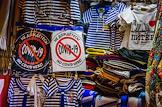 Коронавирус COVID-19. Жанровая фотография. Футболки с принтами, посвященными борьбе с короновирусом "COVID-19. Не дождетесь!", в сувенирном магазине.