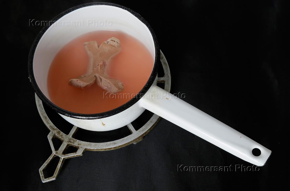 Жанровая фотография. После двадцатиминутного кипячения сосиски вода становится с красноватым оттенком.