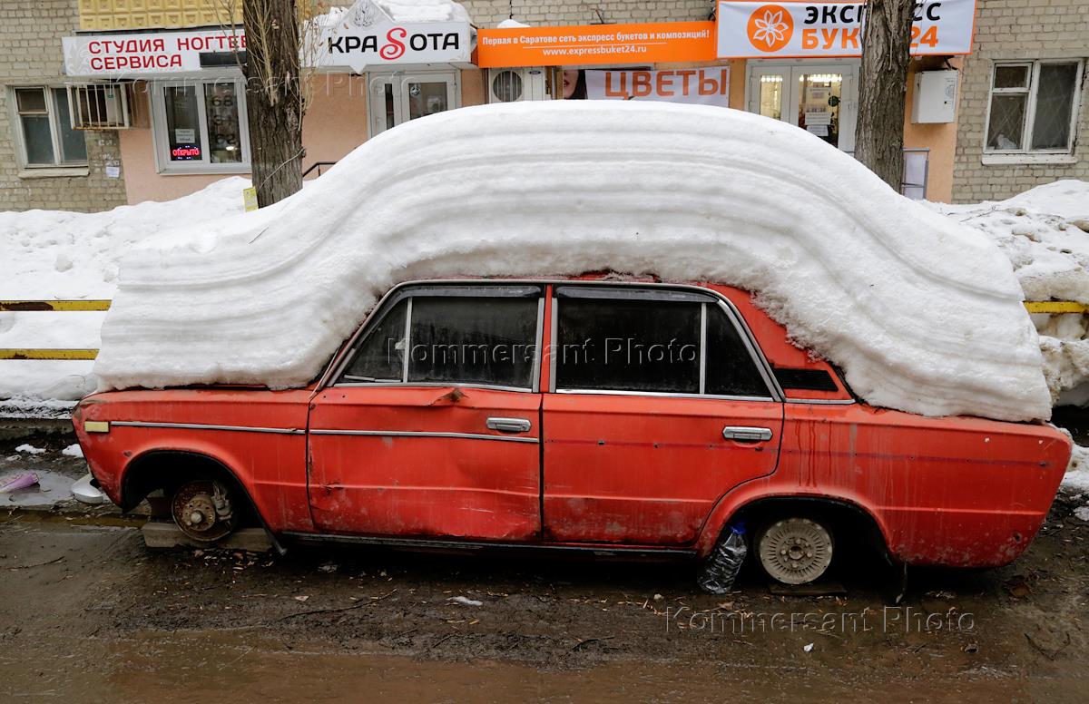 Жанровая фотография. Брошенный занесенный снегом легковой автомоль без колес.