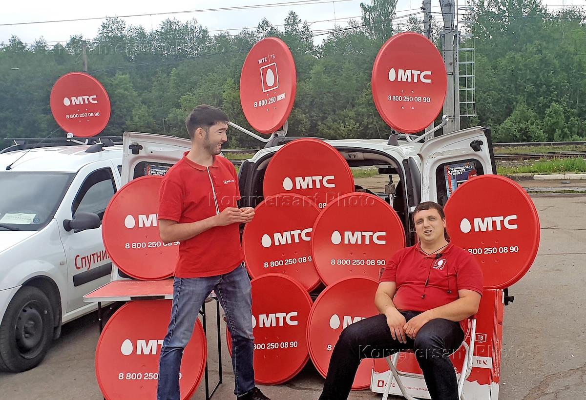 Отмена режима самоизоляции из-за опасности распространения коронавирусной инфекции COVID-19. Жанровая фотография. Мужчины в фирменных майках компании МТС продают на улице спутниковые антенны-красные тарелки МТС.