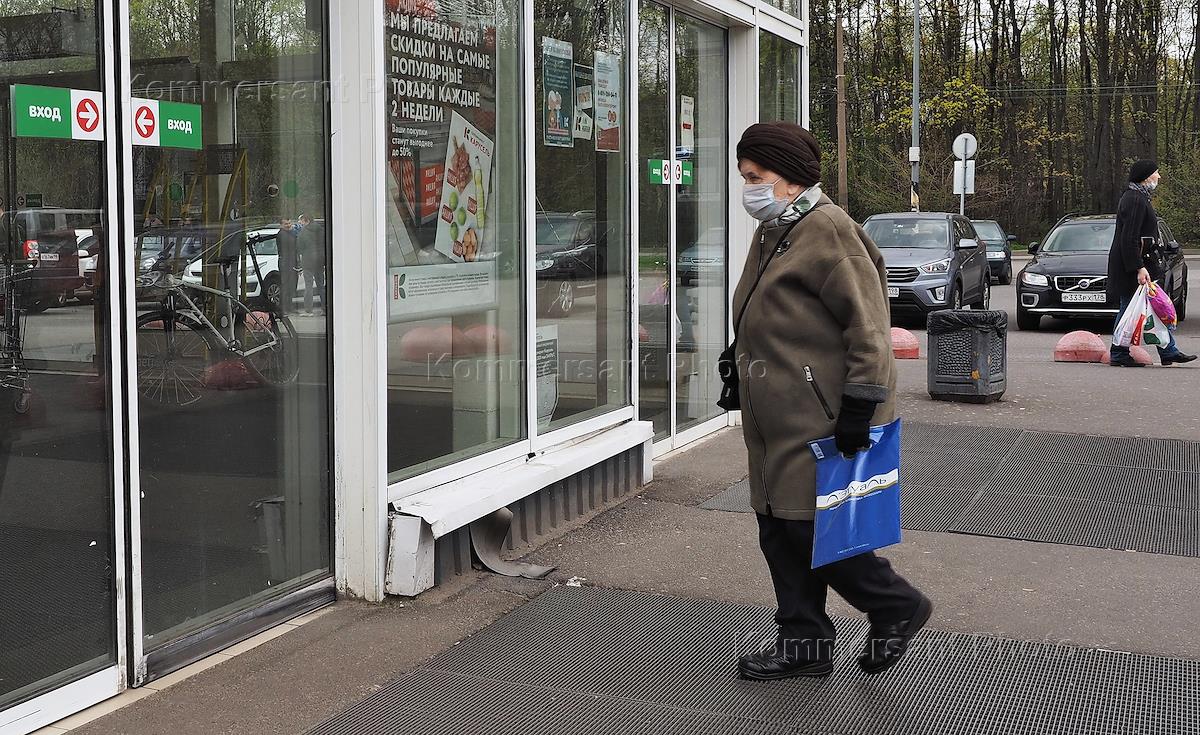 Санкт-Петербург во время режима самоизоляции из-за опасности распространения коронавирусной инфекции COVID-19. Жанровая фотография. Гипермаркет "Карусель" на улице Карбышева за три дня до полного закрытия объявил тотальную распродажу. Покупательница в медицинской маске у входа в магазин.