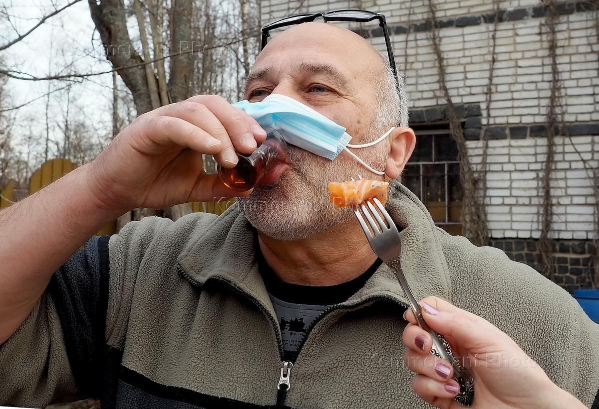 Ленинградская область во время режима самоизоляции из-за опасности распространения коронавирусной инфекции COVID-19. Жанровая фотография. Пикник на даче с приготовлением барбекью и с соблюдением правил карантина. Мужчина в медицинской маске выпивает.
