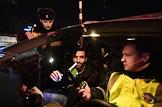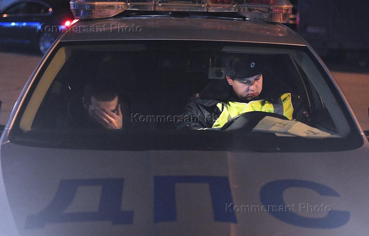 Рейд ГИБДД Москвы по выявлению нетрезвых водителей. Сотрудники дорожно-патрульной службы (ДПС) во время задержания нетрезвого водителя.
