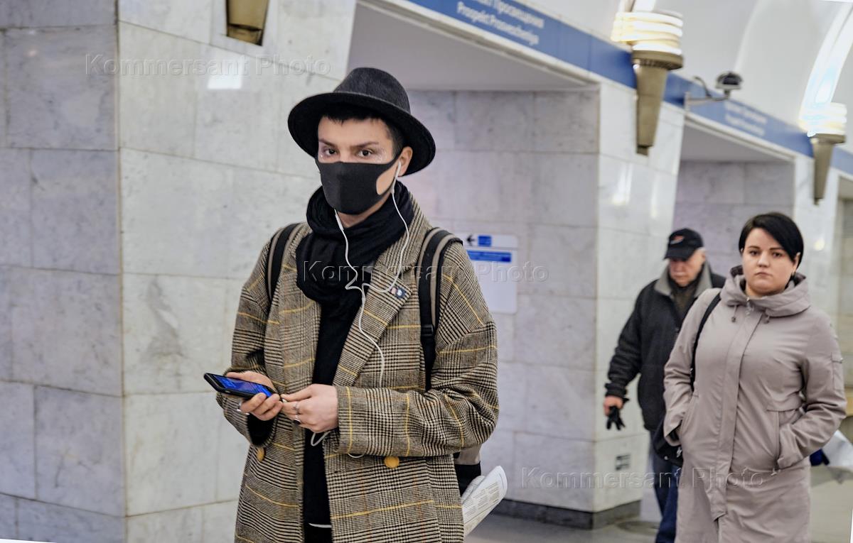 Preventive measures and precautions against coronavirus COVID-19. Genre photo. Passengers wearing face masks in the Saint Petersburg metro.