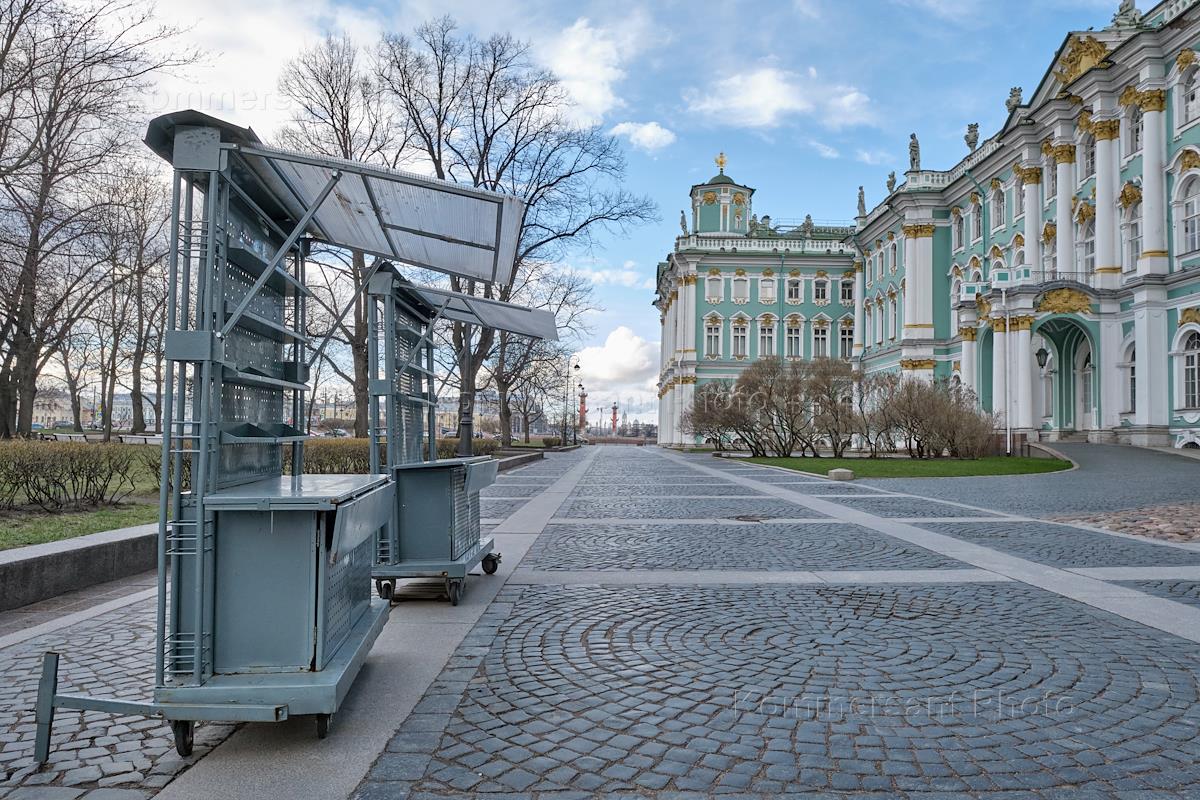 Санкт-Петербург во время режима самоизоляции из-за опасности распространения коронавирусной инфекции COVID-19. Жанровая фотография. Дворцовая площадь и здание Государственного Эрмитажа.