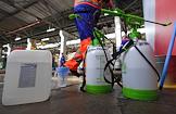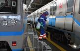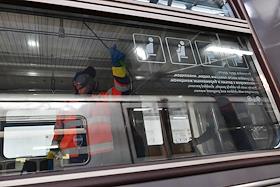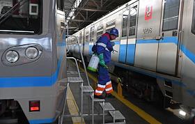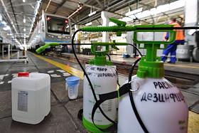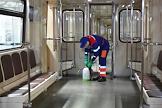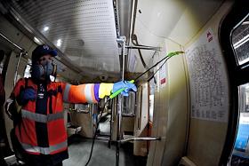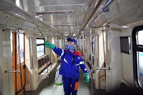 Пресс-тур, посвященный дезинфекции подвижного состава Московского метрополитена в электродепо "Красная Пресня". Меры предосторожности и профилактики против коронавируса COVID-19. Жанровая фотография. Сотрудники метрополитена во время обработки дезинфицирующими средствами поездов метро.