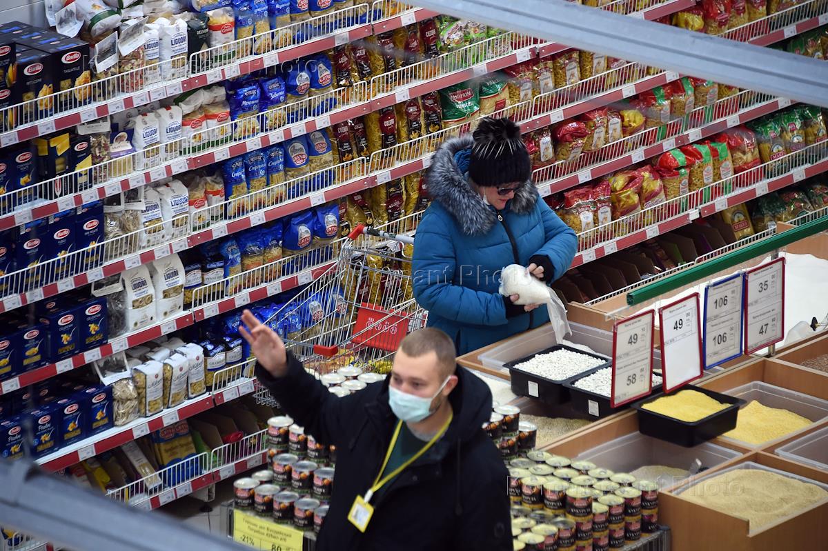 Меры предосторожности против коронавируса COVID-19. Жанровая фотография. Покупатели в медицинских масках в бакалейном отделе супермаркета.