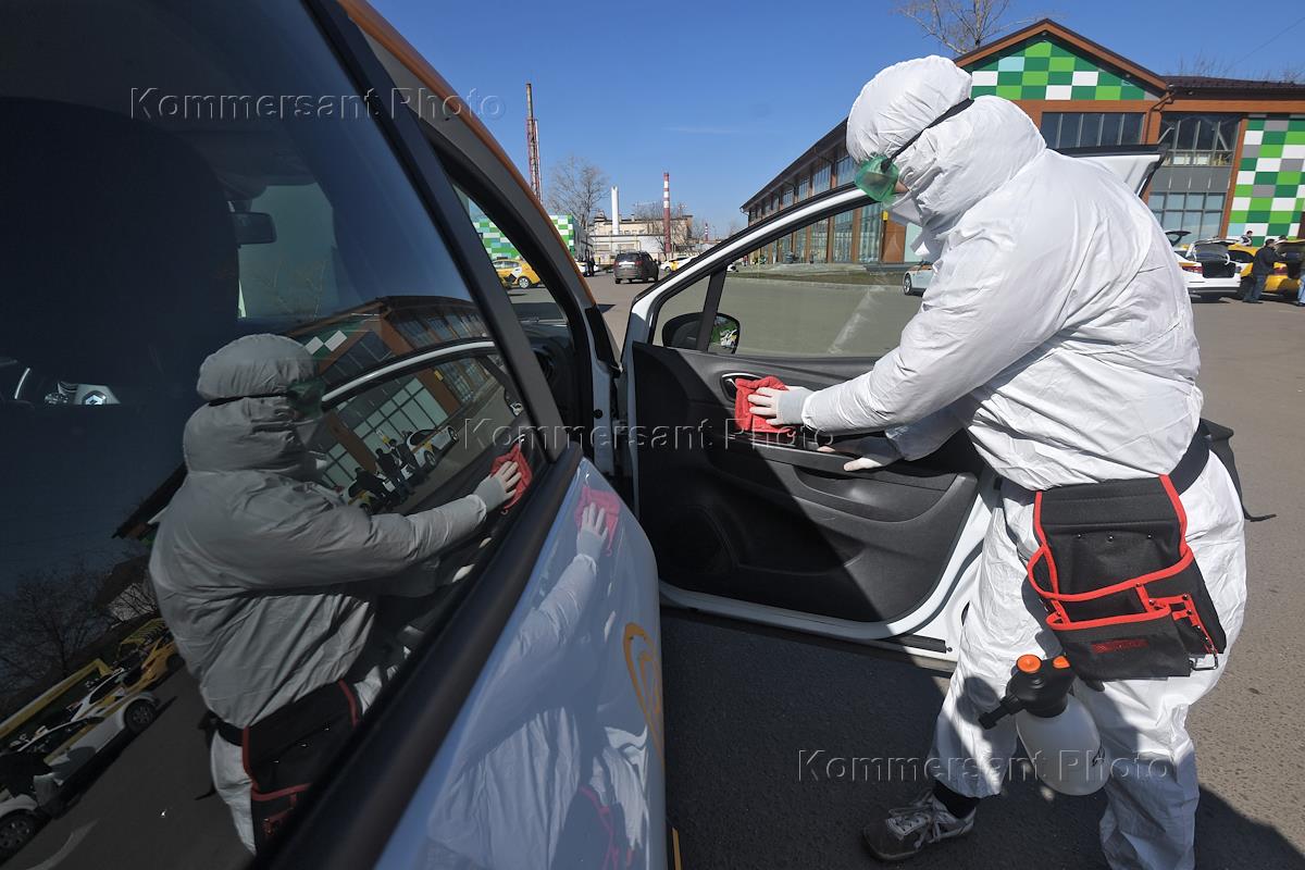 Меры предосторожности и профилактики против коронавируса COVID-19. Жанровая фотография. Обработка дезинфицирующими средствами автомобилей компании "Яндекс. Такси" и автомобилей каршеринга "Яндекс. Драйв".