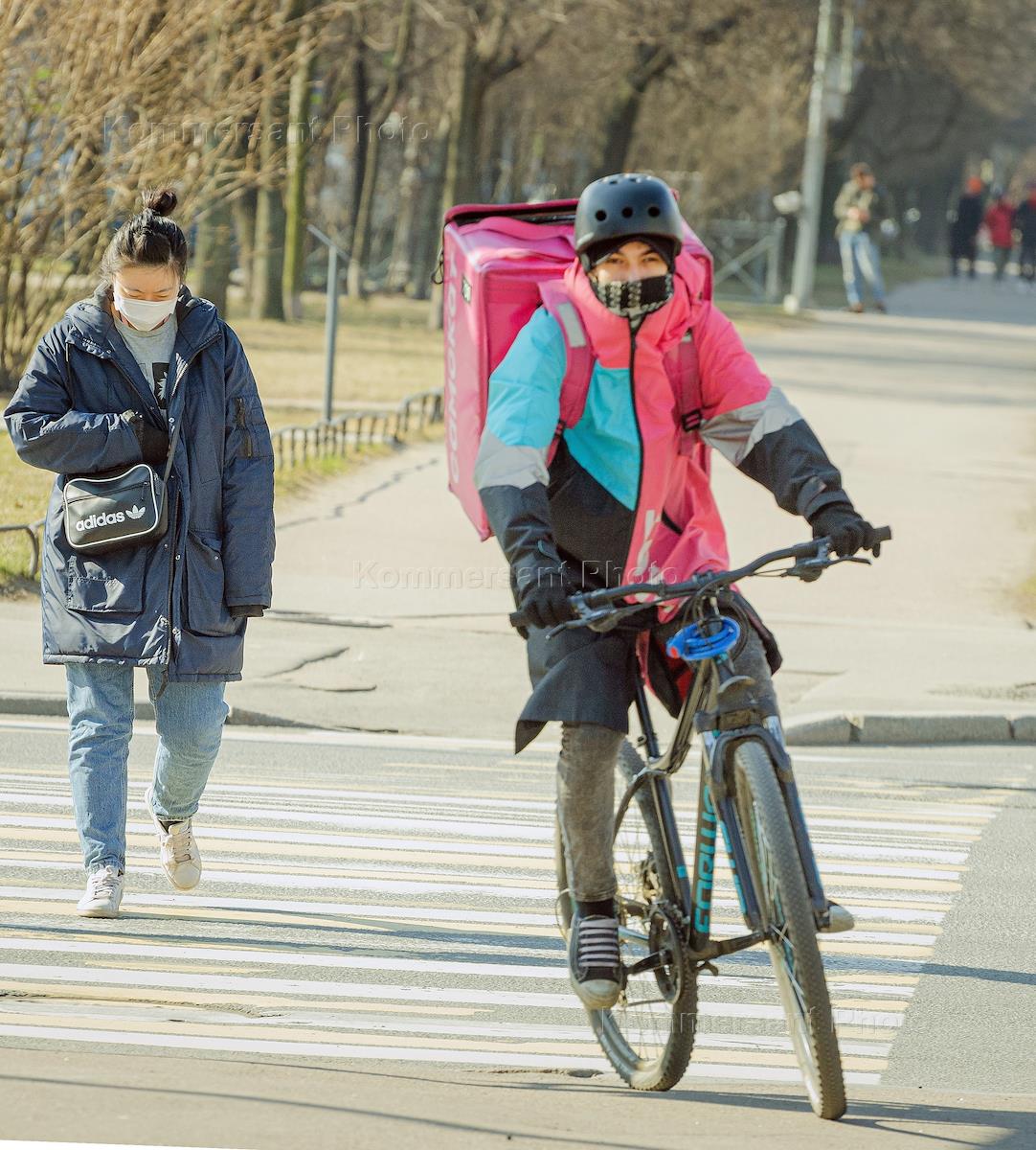 Меры предосторожности и профилактики против коронавируса COVID-19. Жанровая фотография. Люди в медицинских масках на улицах Санкт-Петербурга. Курьер службы доставки на велосипеде.