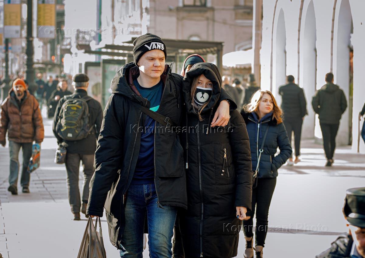 Меры предосторожности и профилактики против коронавируса COVID-19. Жанровая фотография. Люди в медицинских масках на улицах Санкт-Петербурга.