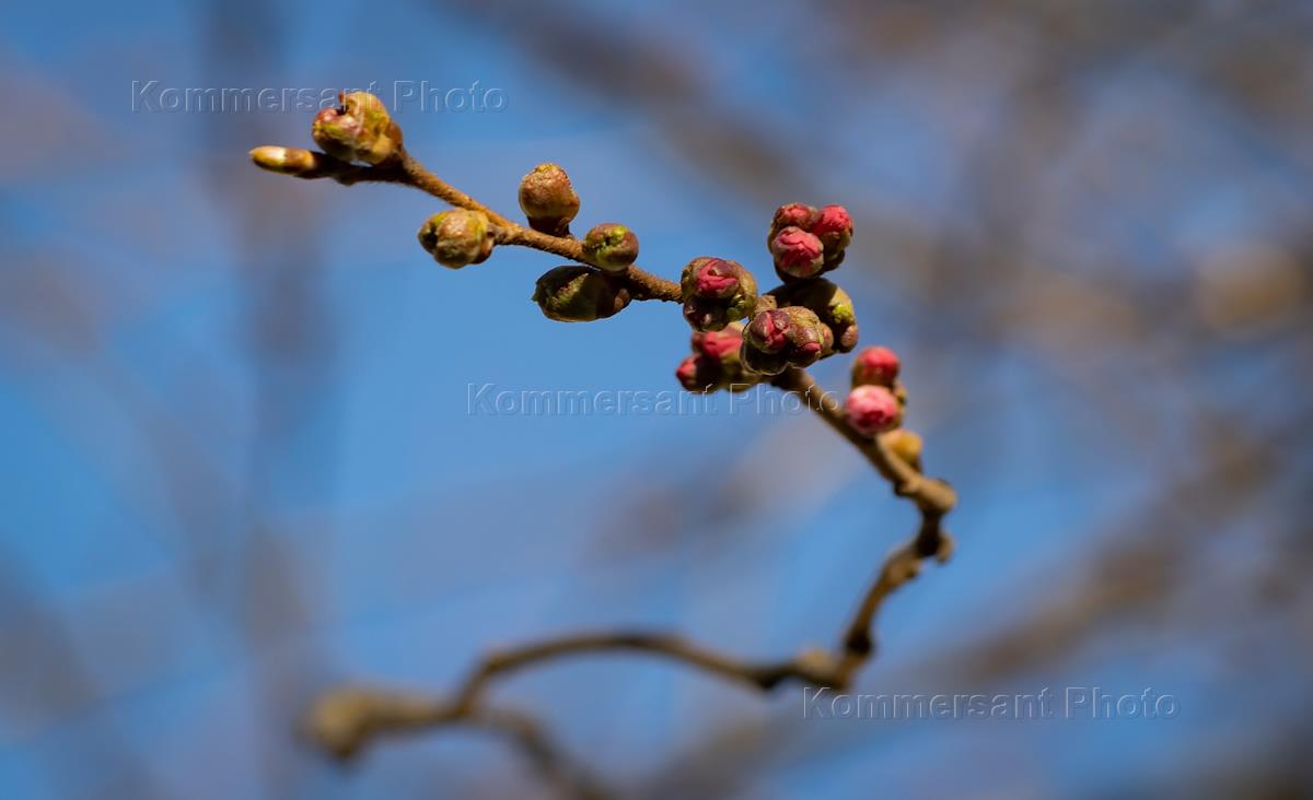 Genre photo. Sakura branch with swollen buds.