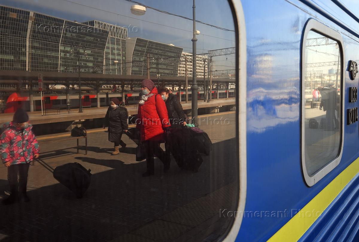 Меры предосторожности и профилактики против коронавируса COVID-19.Российские пассажиры поезда № 906 сообщением "Киев-Москва", приехавшие из Украины, в медицинских масках на перроне Киевского вокзала.