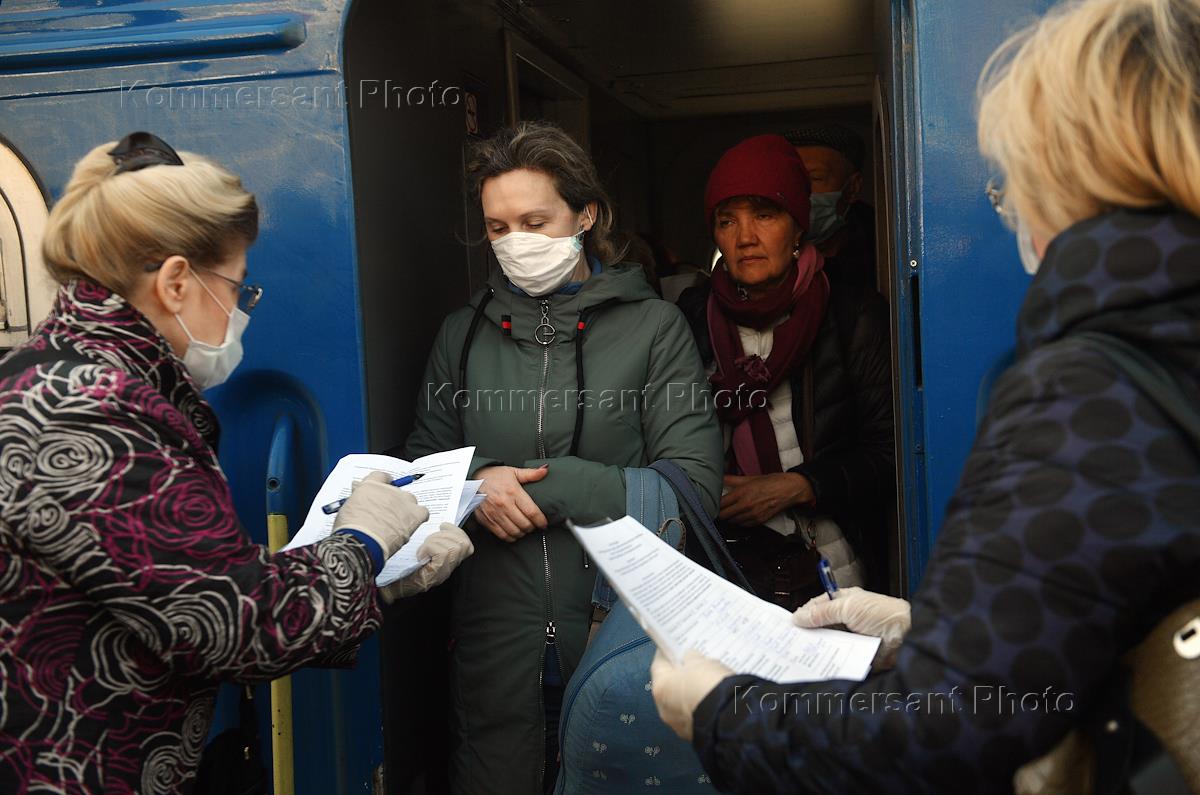 Preventive measures and precautions against coronavirus COVID-19. Russian passengers of the Train No. 906 Kiev-Moscow arrived from Ukraine are seen in the face masks on the platform of the Kievsky railway station.