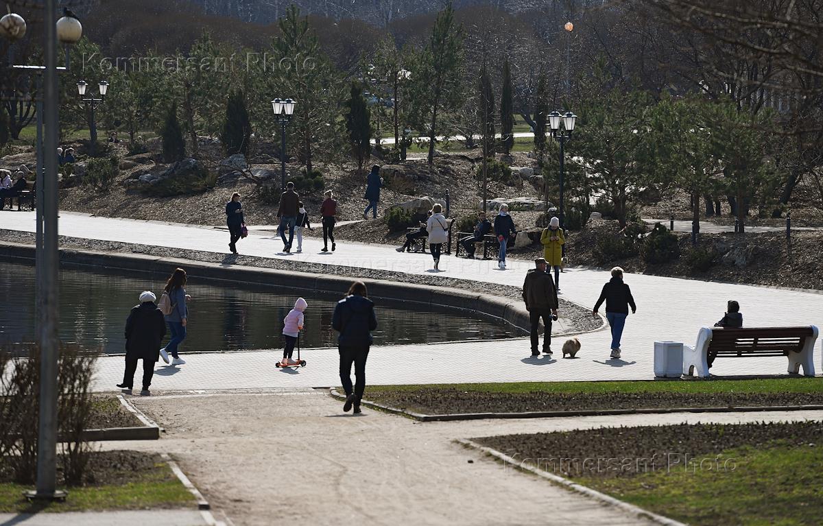 Preventive measures and precautions against coronavirus COVID-19. Genre photo. People have a rest in Golyanovsky park.