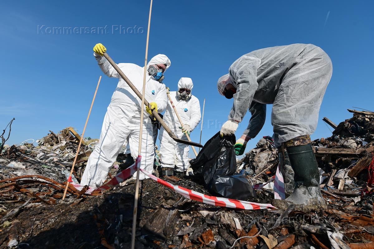 Сотрудники компании ГУП "Экострой" во время работ по утилизации опасных отходов и мусора на несанкционированной свалке во Всеволожском районе Ленинградской области.