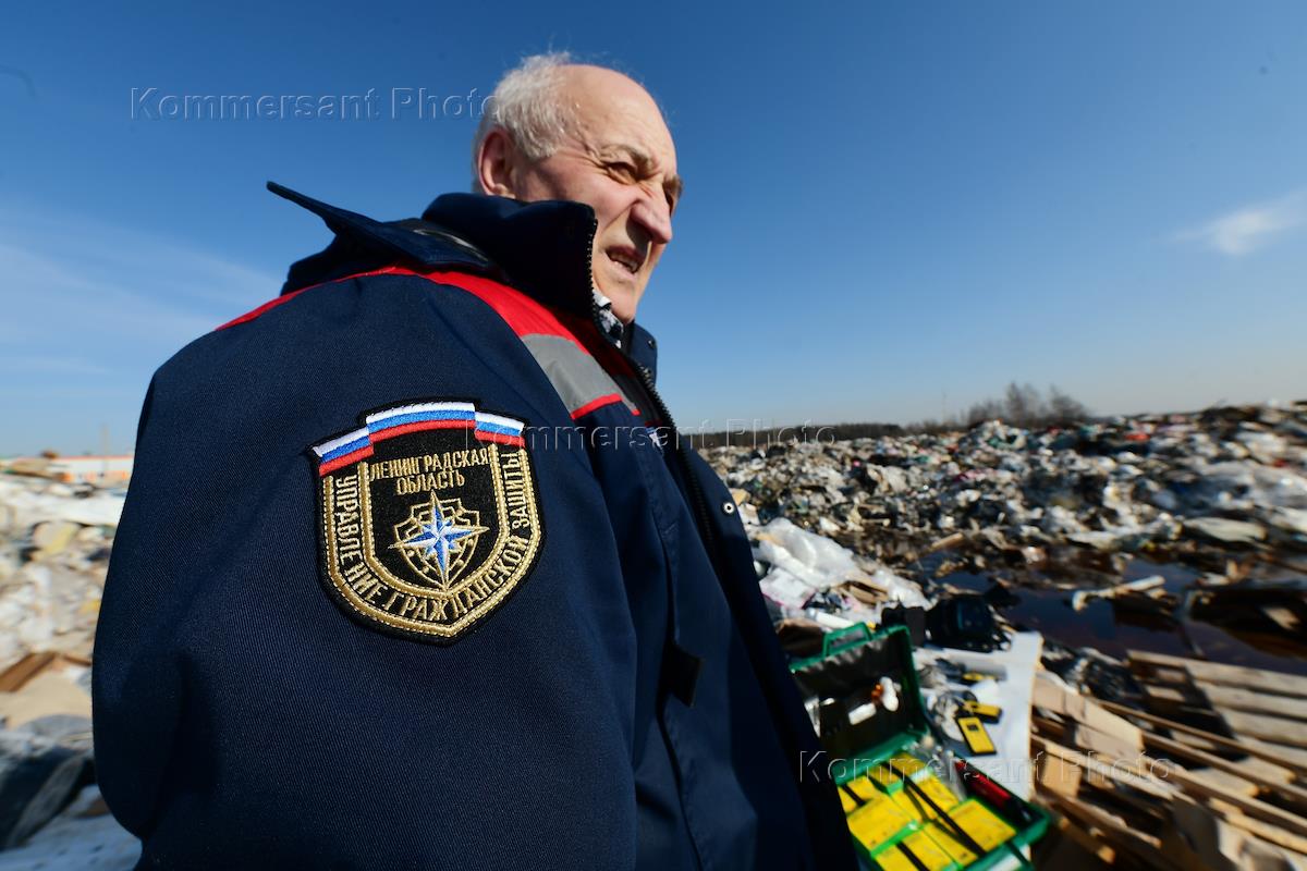 Вывоз опасных отходов II, III и IV классов опасности с несанкционированной свалки на улице Колхозной в деревне Старая Всеволожского района. Сотрудник Управления гражданской защиты Ленинградской области во время работ по утилизации опасных отходов и мусора.