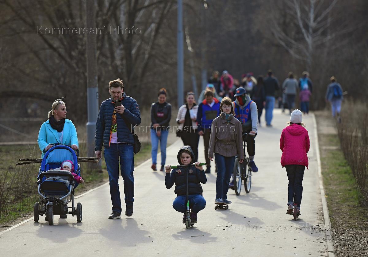Preventive measures and precautions against coronavirus COVID-19. Genre photo. People have a rest in the Pokrovskoye-Streshnevo Park.
