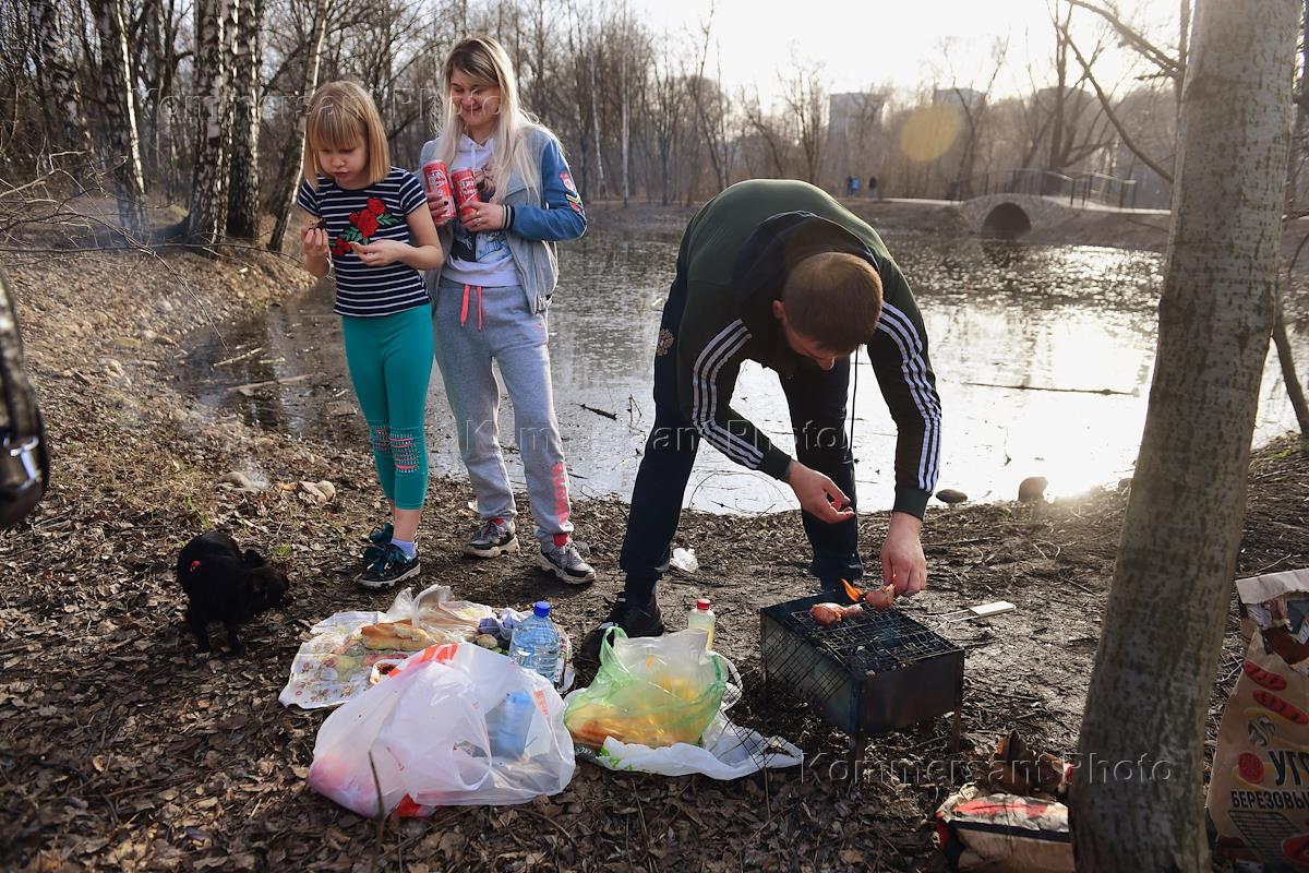 Preventive measures and precautions against coronavirus COVID-19. Genre photo. People have a rest in the Pokrovskoye-Streshnevo Park.