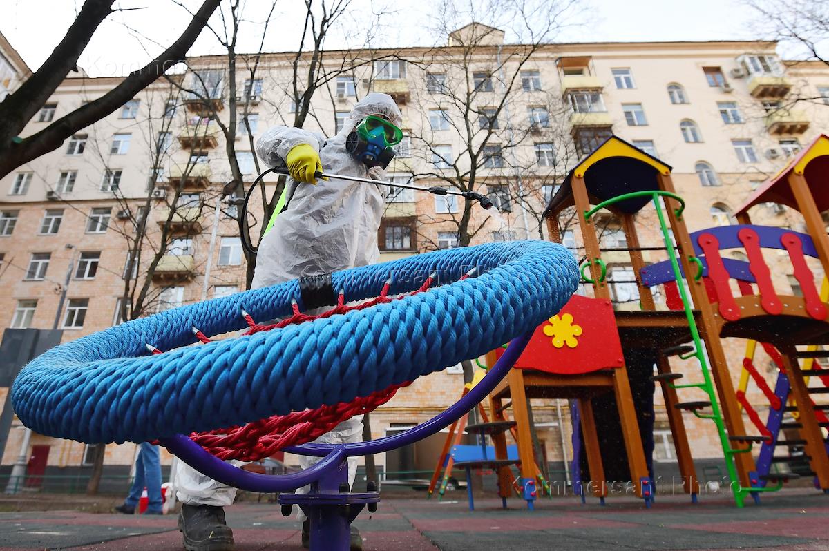 Preventive measures and precautions against coronavirus COVID-19. Municipal workers disinfect children's playgrounds in courtyards.