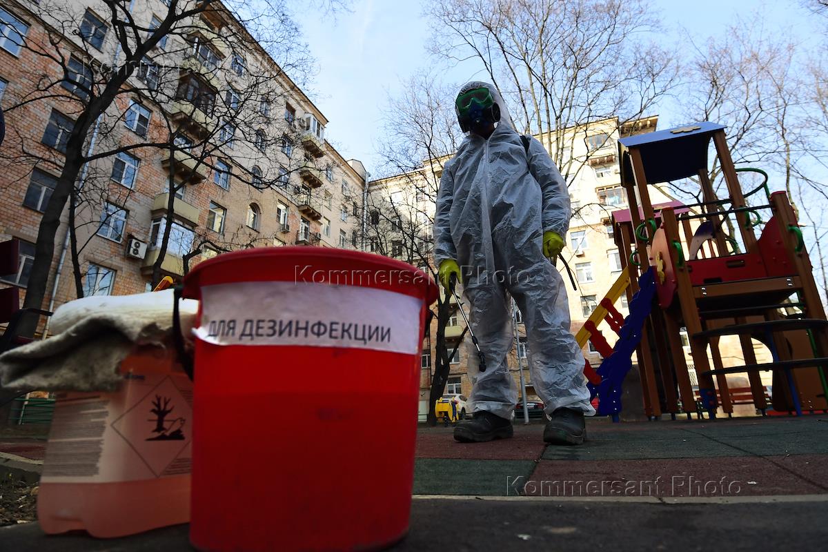 Preventive measures and precautions against coronavirus COVID-19. Municipal workers disinfect children's playgrounds in courtyards.