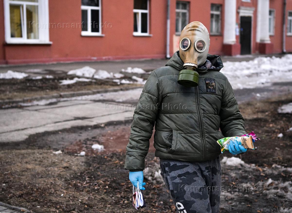 Preventive measures and precautions against coronavirus COVID-19. Genre photo. Young man wearing gas mask walks is seen during the coronavirus pandemic.