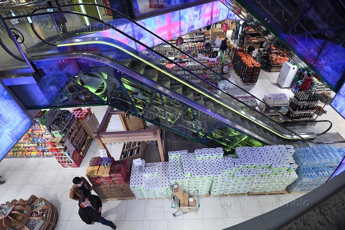 Coronavirus COVID-19 Quarantine. Genre photo. Customers in the trading floor of a hypermarket. Picnic Products.