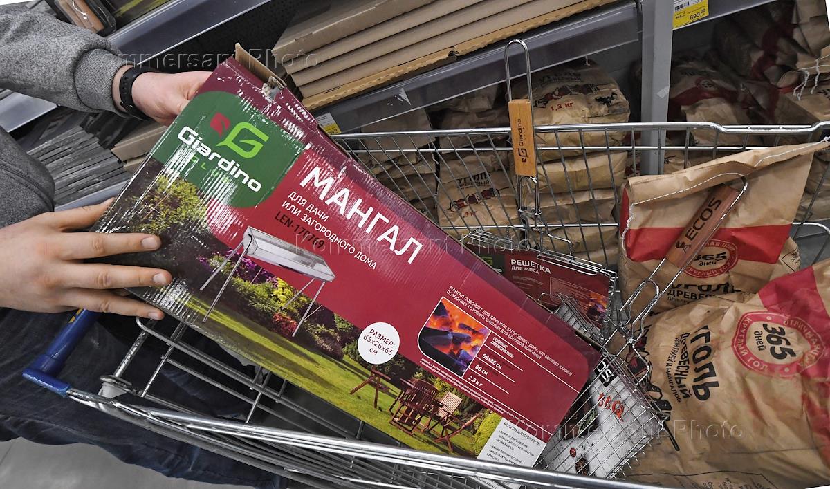 Coronavirus COVID-19 Quarantine. Genre photo. Customers in the trading floor of a hypermarket. Picnic Products.
