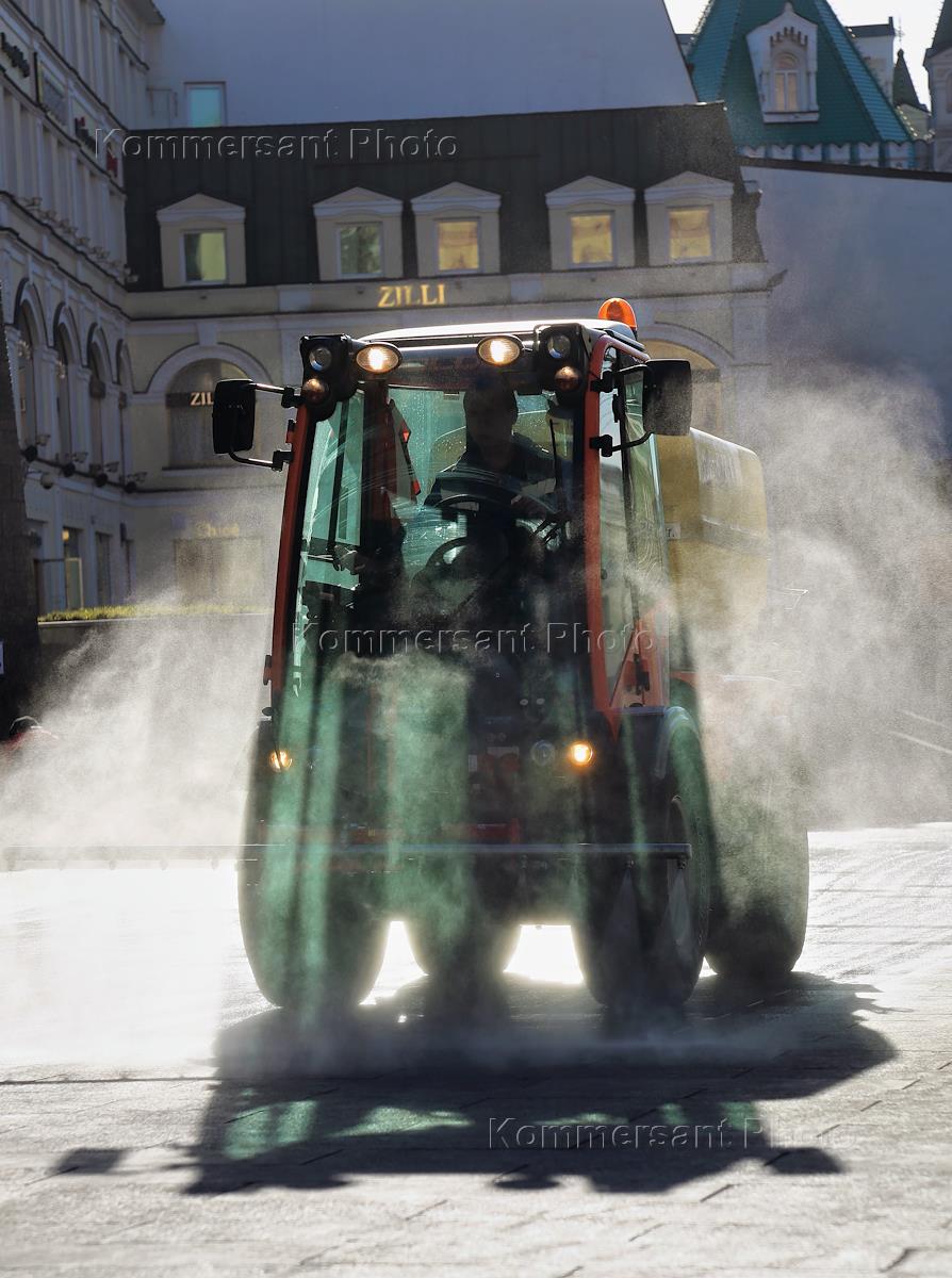 Меры предосторожности и профилактики против коронавируса COVID-19. Сотрудники коммунальных служб города во время промывки улиц дезинфицирующим раствором.