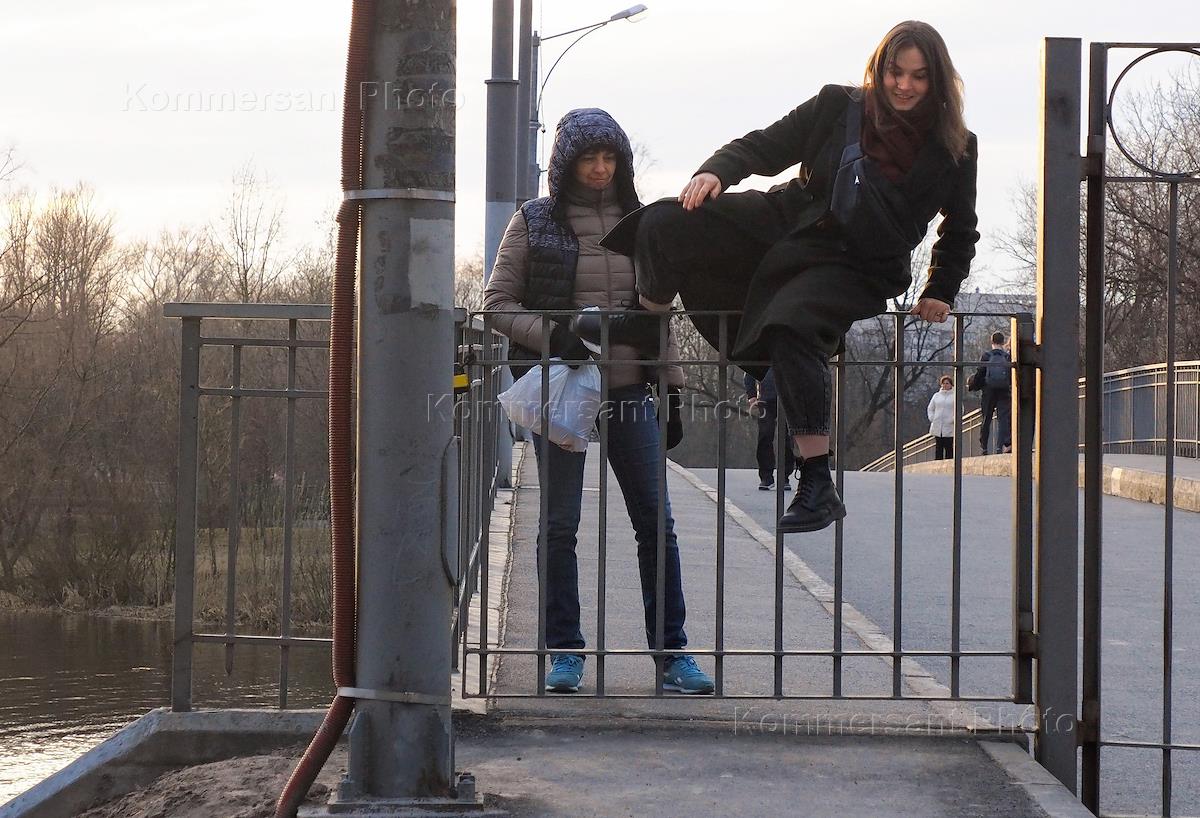 Genre photo. Young woman climes over the fence of the Kolpino Culture and Leisure Park on the Chukhonka island closed because of coronavirus pandemic.
