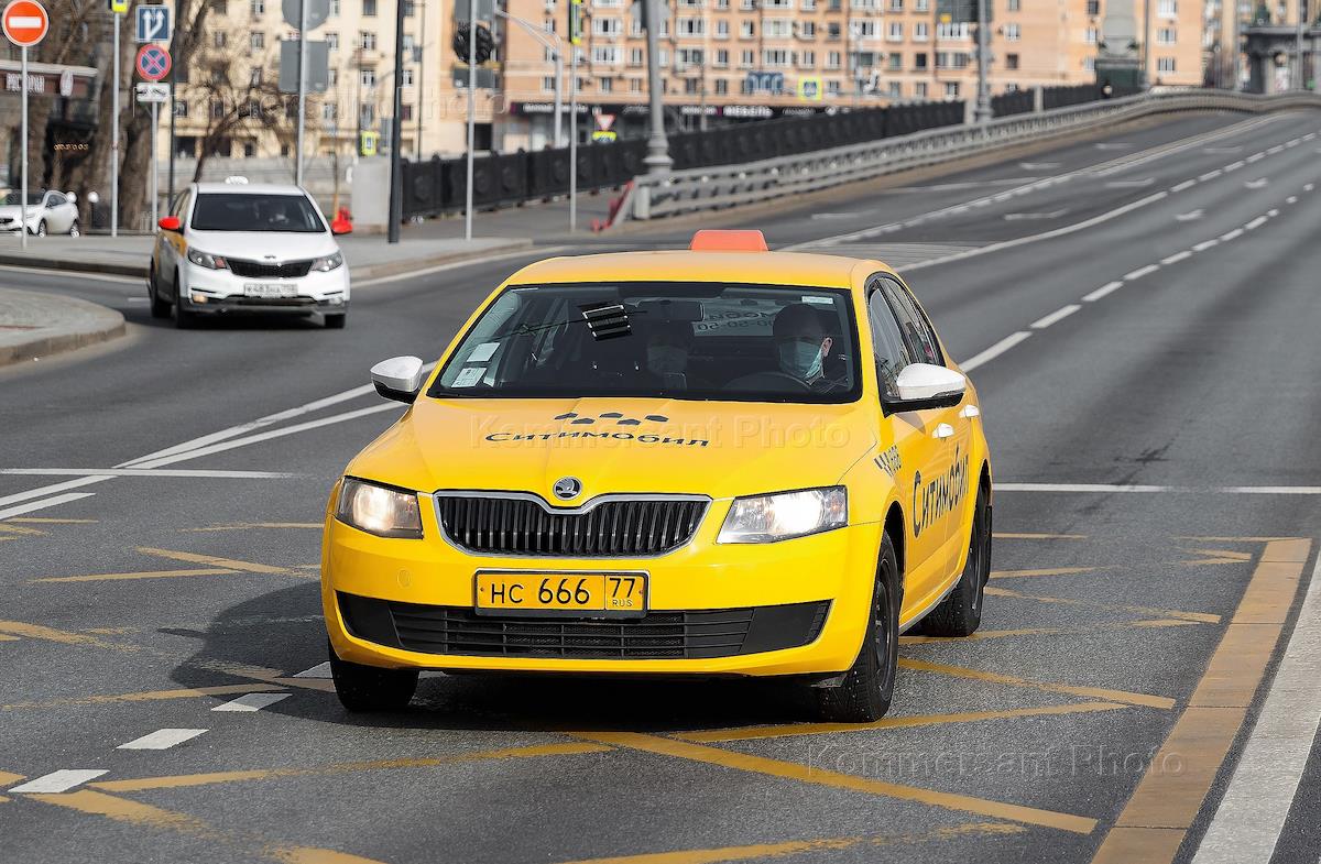 Виды Москвы во время карантина коронавируса COVID-19. Жанровая фотография. Такси "Ситимобиль" на проезжей части.