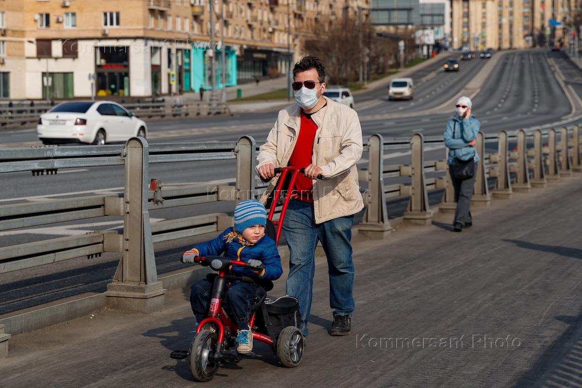 Views of Moscow during Coronavirus COVID-19 Quarantine. Genre photo. Father wearing face mask and his child on a tricycle take a walk on the Borodinsky bridge.