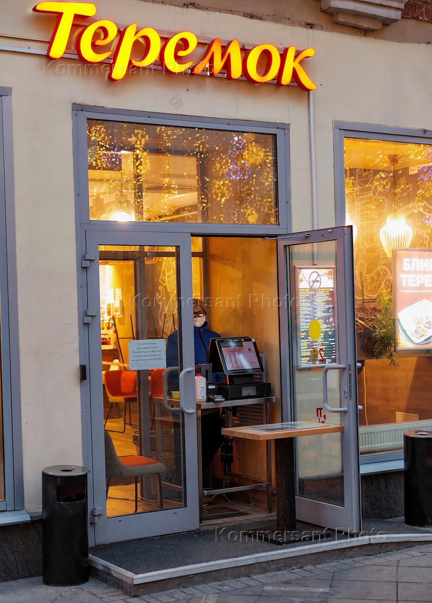 Views of Moscow during Coronavirus COVID-19 Quarantine. Genre photo. Teremok cafe offers take-out and delivery.