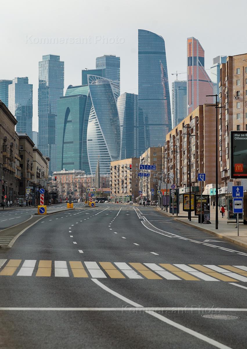 Views of Moscow during Coronavirus COVID-19 Quarantine. Genre photo. Half-empty street near the European shopping and entertainment center.