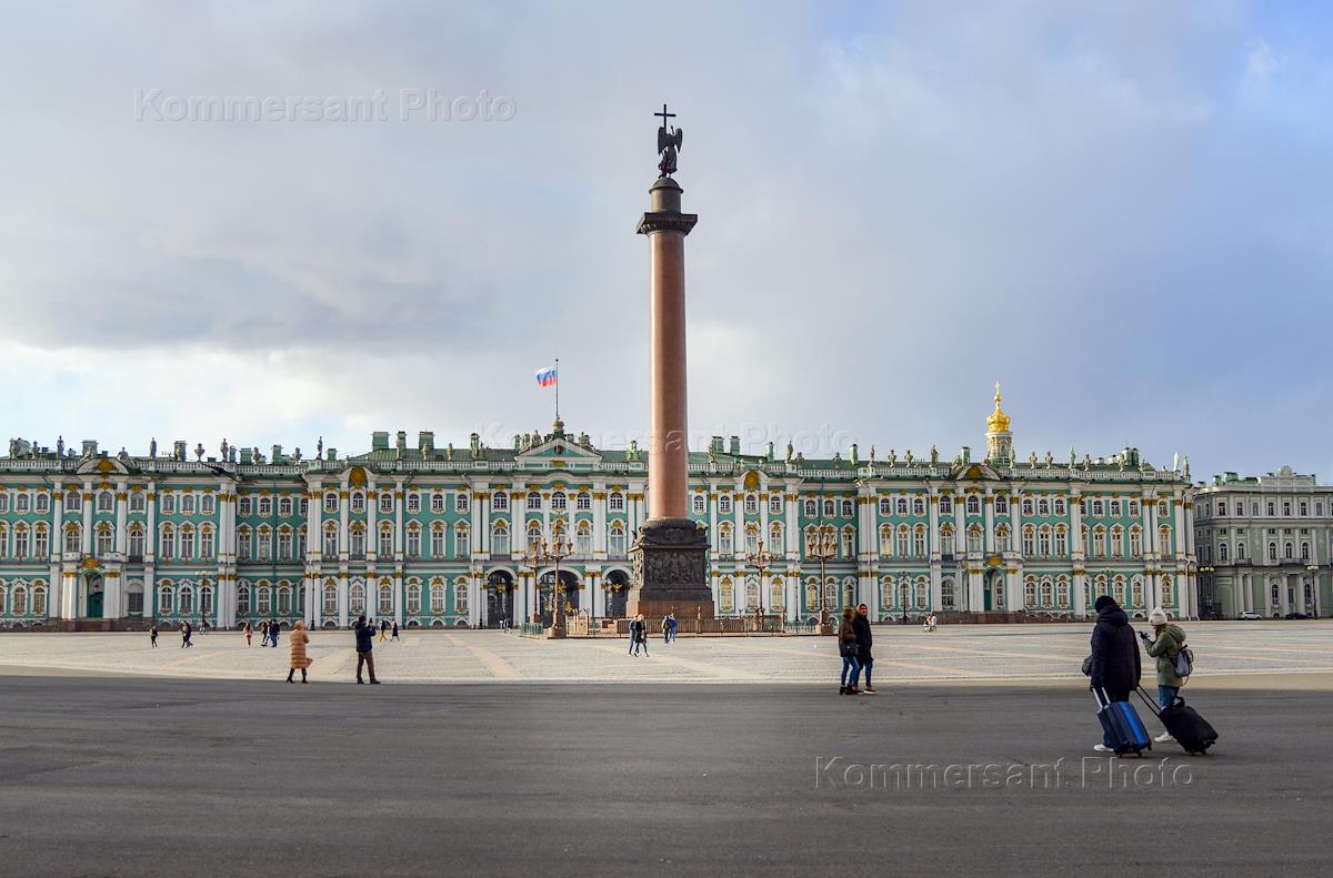 Виды Санкт-Петербурга во время карантина коронавируса COVID-19. Жанровая фотография. Александровская колонна и здание Эрмитажа на Дворцовой площади.
