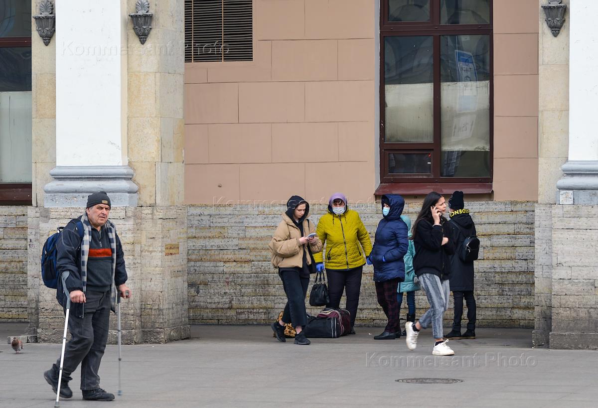 Views of St. Petersburg during Coronavirus COVID-19 Quarantine. Genre photo. Elderly man on crutches walks past a group of women in face masks.