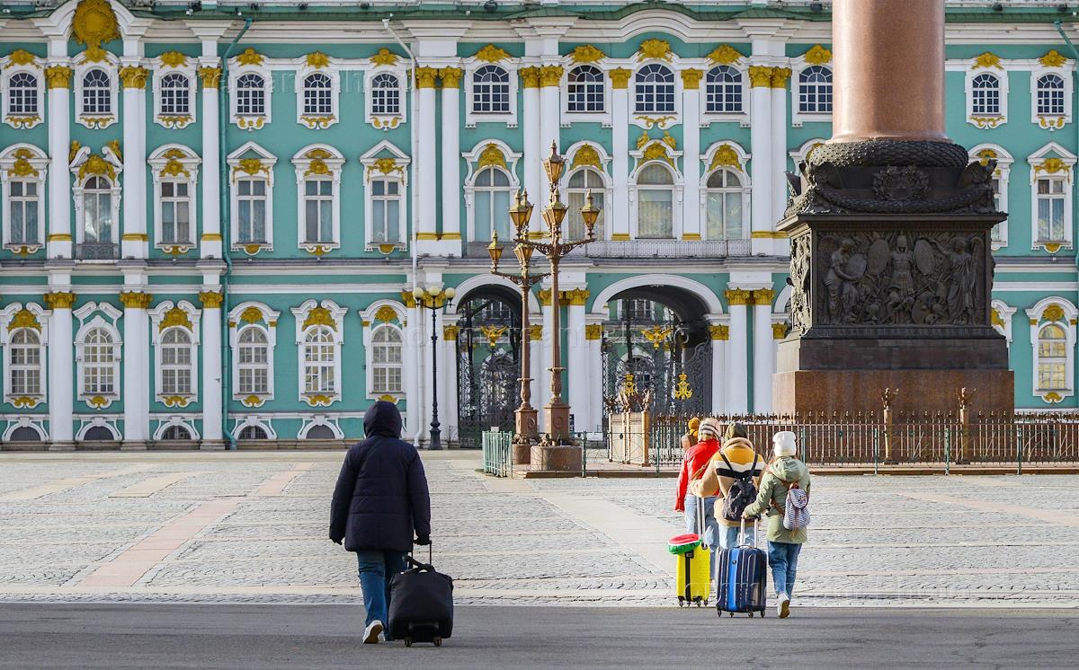 Views of St. Petersburg during Coronavirus COVID-19 Quarantine. Genre photo. Tourists with bags stand on the Palace Square.
