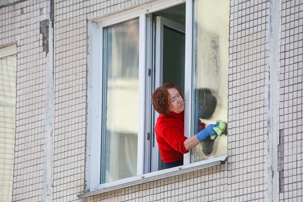Preventive measures and precautions against coronavirus COVID-19. Genre photo. Elderly woman washes windows in her apartment.