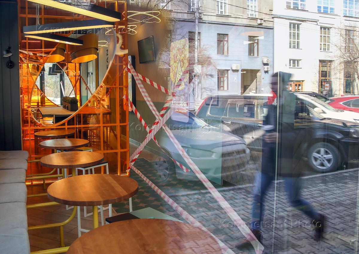 Виды Новосибирска во время карантина из-за опасности распространения коронавирусной инфекции COVID-19. Жанровая фотография. Сотрудник ресторана быстрого обслуживания, закрытого для посетителей.