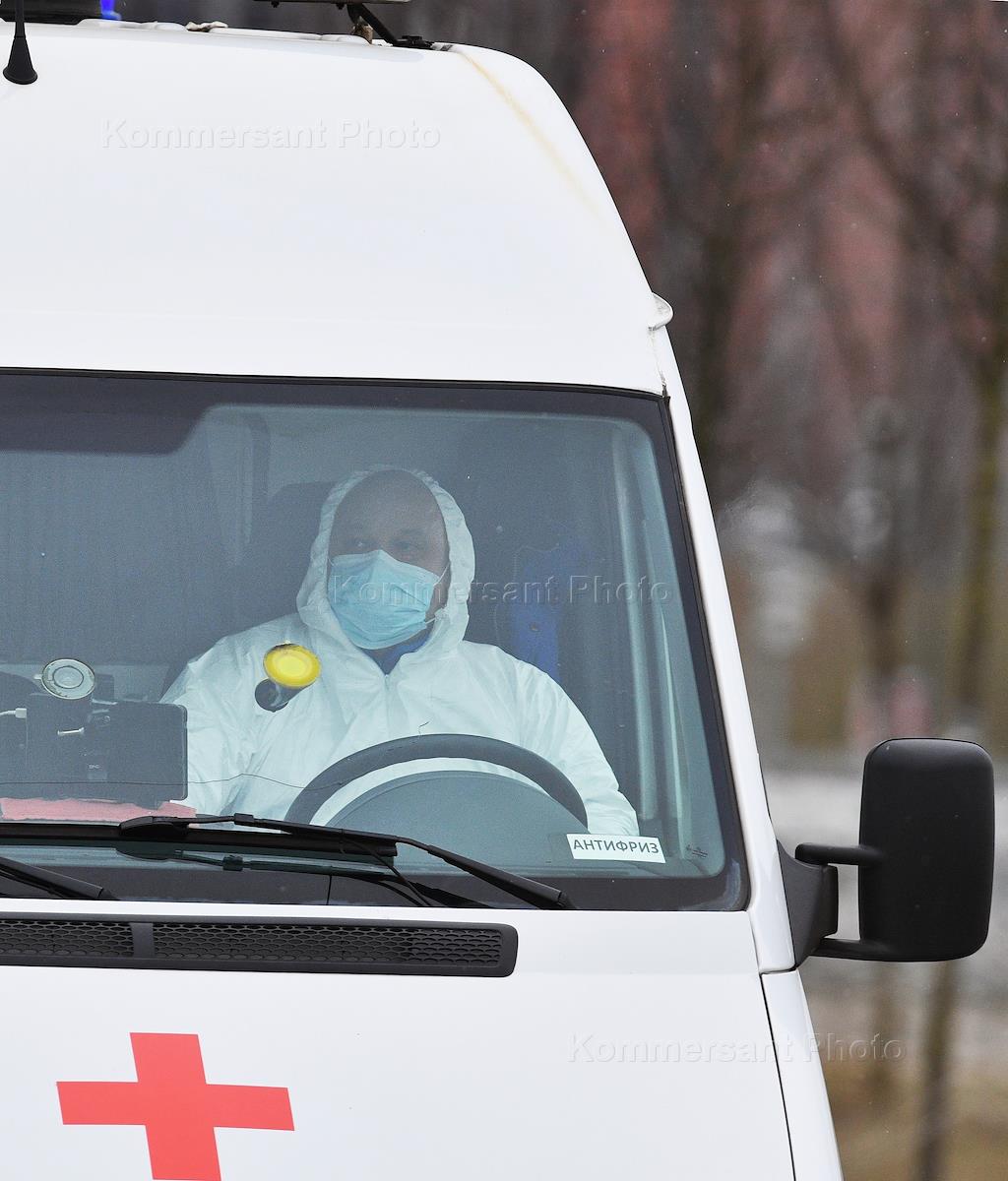 Preventive measures and precautions against coronavirus COVID-19. Genre photo. Novomoskovsky Medical Center in the Kommunarka village of New Moscow. Ambulance car with a driver wearing protective suit and face mask is seen at the entrance to the Center.
