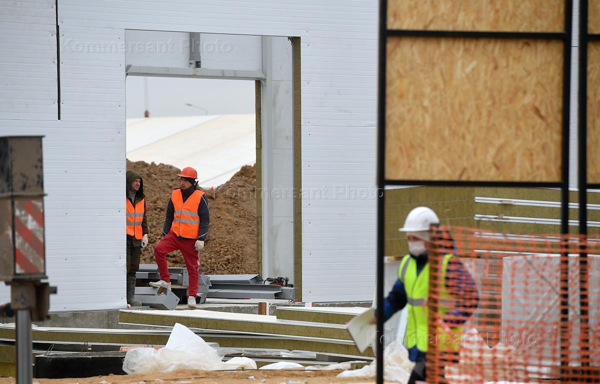 Construction of a mobile complex for a new infectious diseases hospital in New Moscow. Workers wearing respirator masks.
