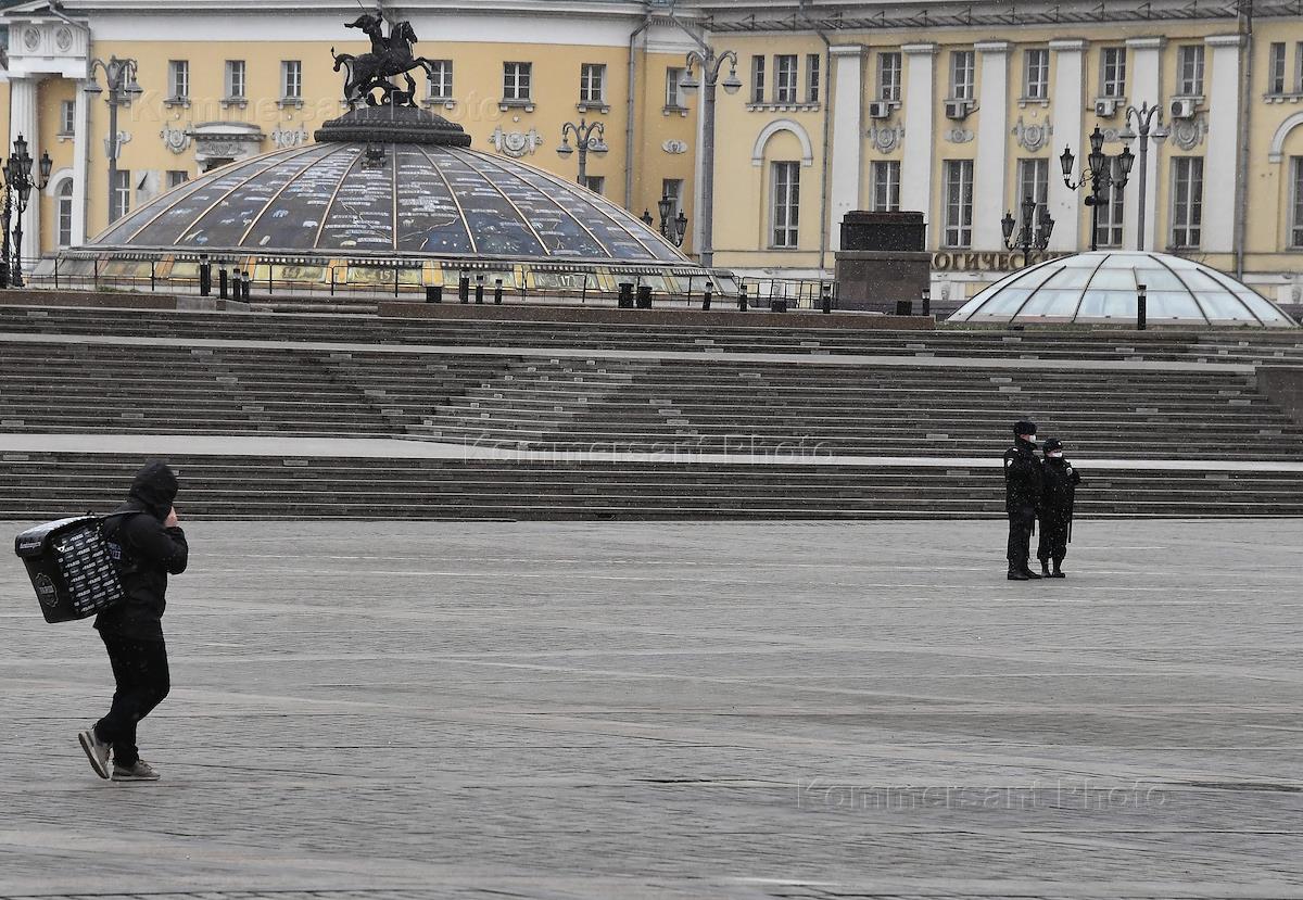 Виды Москвы во время карантина из-за опасности распространения коронавирусной инфекции COVID-19. Сотрудники полиции и курьер доставки еды в медицинских масках на Манежной площади. Торговый комплекс "Охотный ряд".