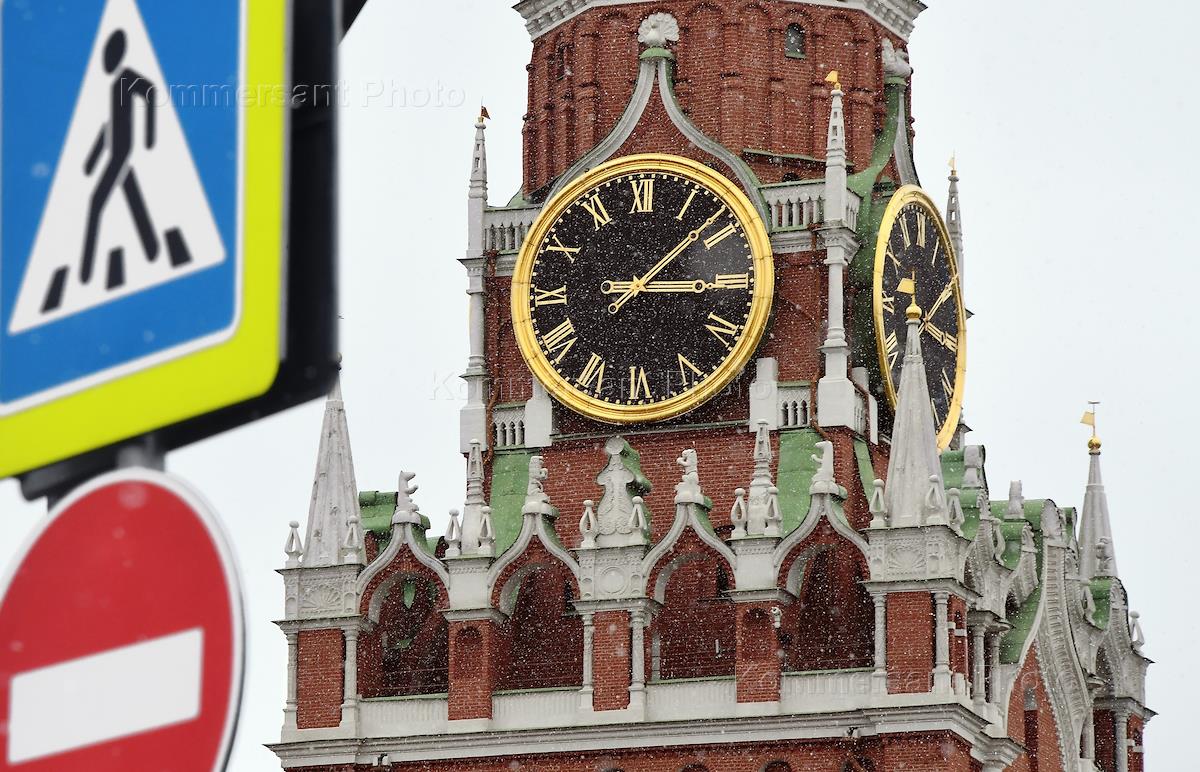 Views of Moscow during Coronavirus COVID-19 Quarantine. Clock on the Spasskaya Tower of the Kremlin.