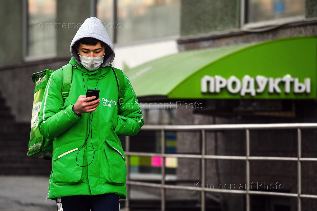 Views of Moscow during during Coronavirus COVID-19 Quarantine. Courier of the Yandex.Food delivery service company wearing face mask walks down on the street.